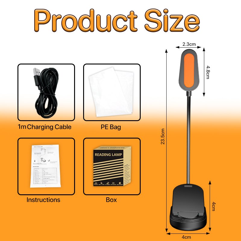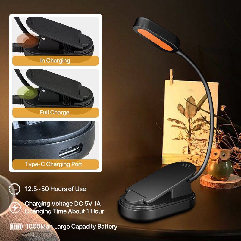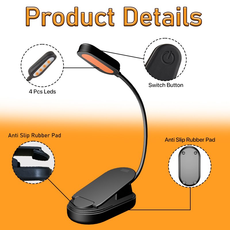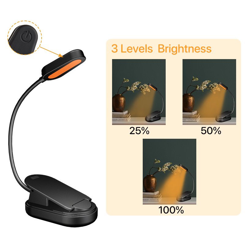 DS114 is sleek and lightweight reading light,combines portability with robust functionality, crafted from durable black ABS for long-lasting use. Featuring 4 energy-efficient 1W SMD2835 LEDs (80 lumens),Powered by a 1000mAh rechargeable battery, it charges fully in just 1–2 hours via 5V/0.5A USB and offers extended runtime with 3-level dimming (25%/50%/100%)—providing up to 50 hours on low mode or 12.5 hours at maximum brightness. Its intuitive one-button control simplifies switching between modes and brightness settings, while the compact design makes it ideal for book lovers, travelers, campers, or emergency use, ensuring reliable lighting wherever you go.
