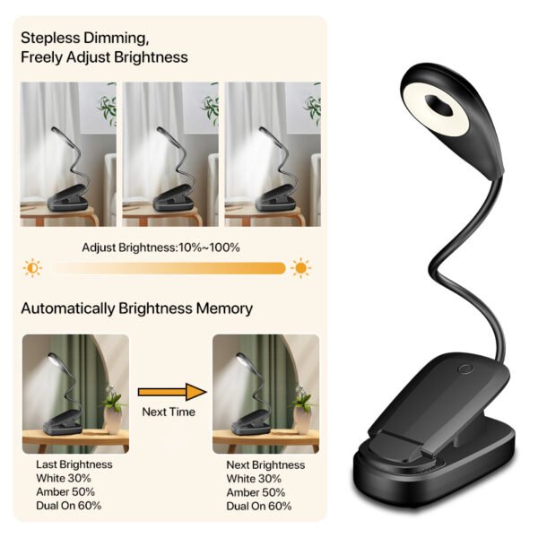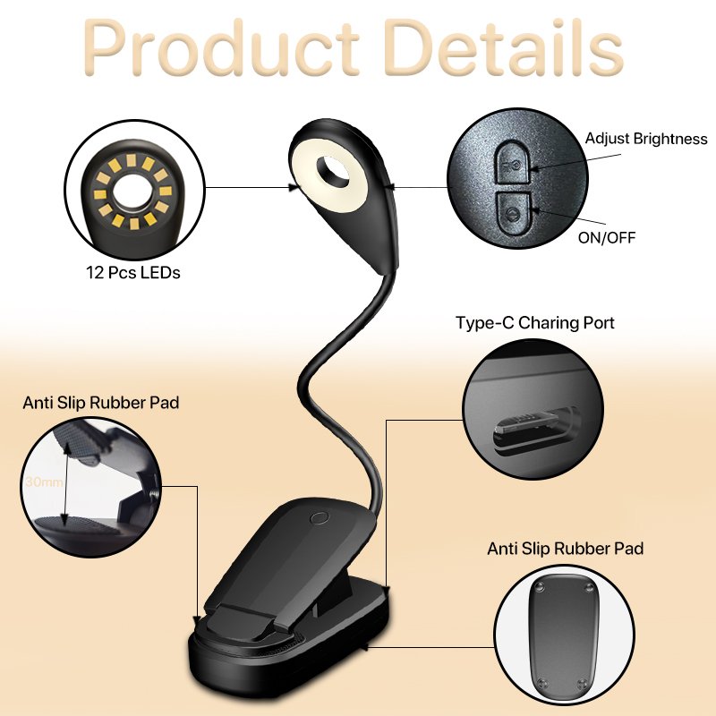 [SUPER LIGHTWEIGHT & CLIP-ON DESIGN] The lightweight and compact book lamp only need a little space to easily carry around. The clamp opens about 1.6 inches and clips on books or ebooks perfectly and tightly. The clip can be opened wide enough to be fixed in various objects. Anti-slippery pads protect your beloved books from being scratched or pinched. It can also stand on your table or desk. Very convenient.