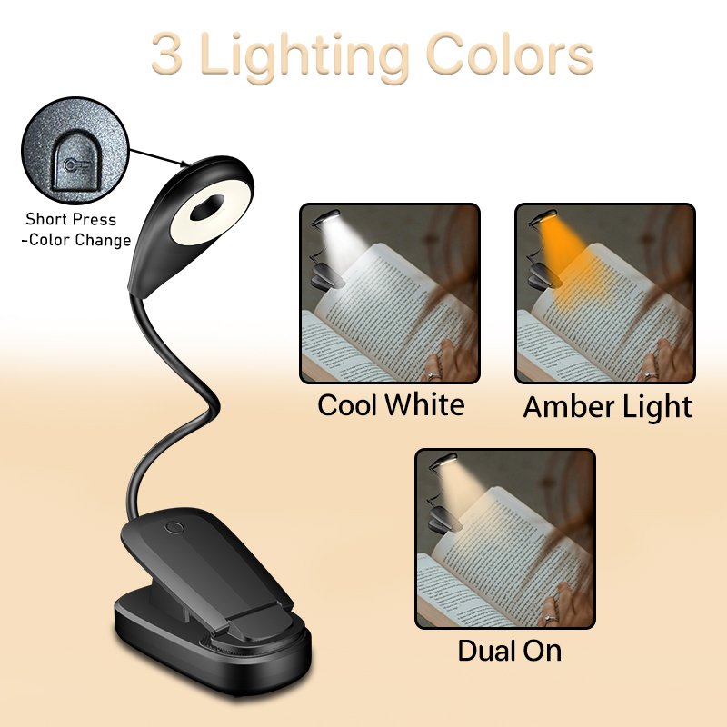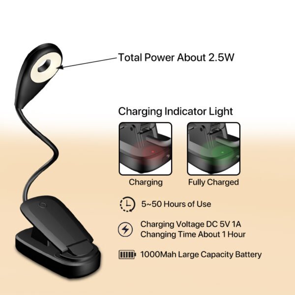 [50+ HOURS FREE FROM CHARGING] This light for reading in bed means no more waste of your money on batteries. The built-in rechargeable battery provides up to 50 hours of reading time in the lowest setting; and 5 hours in the highest setting. It provides a minimum of 5 hours of wireless battery life which means you are far away from charging for at least 1.5 weeks if you read 30 minutes every day. With the provided USB-C cord, 1 hours only for a full charge. No more worries about the battery life.